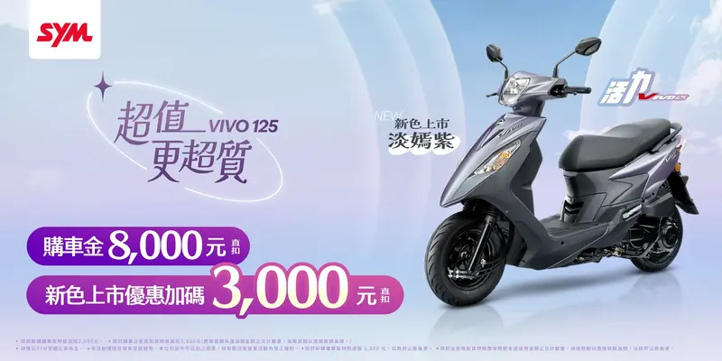活力 125 推出全新車色「淡嫣紫」,三陽同步加碼購車優惠回饋消費者。活力125提供8,000元購車金方案,新色上市期間再加碼3,000元優惠,現賺11,000購車大紅包,讓小資族更輕鬆入手,同時兼顧價格實惠與品質、外型質感,充分展現「超值更超質」的產品魅力。