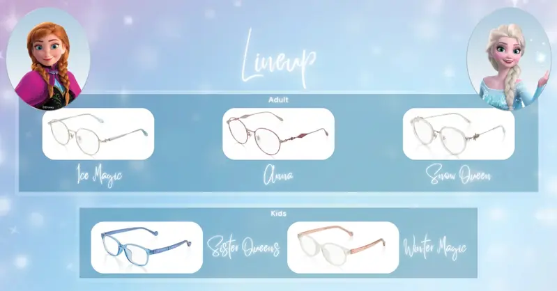 本次系列共推出 5 款特別設計,靈感源自艾莎的冷冽高貴與安娜的溫暖堅毅。OWNDAYS 設計團隊在工藝上進行了奢華升級,每副眼鏡皆隱藏著讓粉絲驚喜的設計細節,鏡腳鑲嵌來自奧地利的施華洛世奇(Swarovski)水晶,隨著光線折射出璀璨光芒;鏡腳尾端則運用雷射雕刻或特殊切削工藝,重現雪花、艾倫戴爾國花等經典元素,將《冰雪奇緣》的奇幻世界濃縮於鏡框之中。