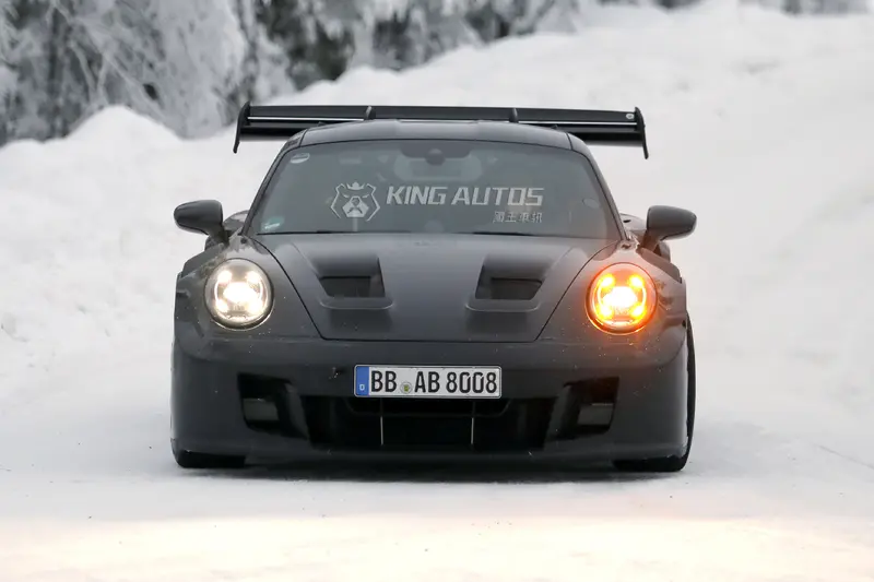 對於像 GT3 RS 這種追求極致空氣力學的道路版賽車而言,外觀的每一吋更動絕非為了美學,而是為了功能。從這輛在北歐測試的原型車來看,車頭的更動僅限於引擎蓋通風口的微調與前緣的小幅修飾,真正的重頭戲在於車尾。