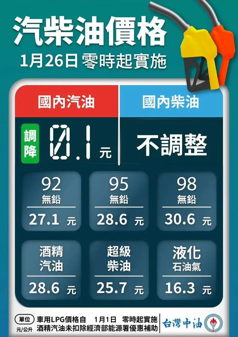 台灣中油公司自明(26)日凌晨零時起汽油調降0.1元、柴油價格不調整,參考零售價格分別為92無鉛汽油每公升27.1元、95無鉛汽油每公升28.6元、98無鉛汽油每公升30.6元、超級柴油每公升25.7元。