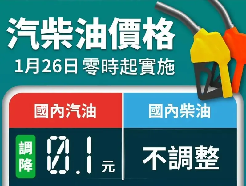 油價快訊|20260126(一)0點起|汽油降1角 柴油不調整