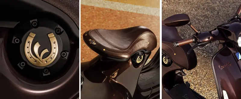 這款限量的特仕版採用獨特的「月桂棕」(Bay color),這深邃的棕色調令人聯想起馬匹深邃且富有光澤的毛色。鋼製車身透過霧面與亮面交錯的細節處理,並點綴精緻的金色飾面,例如座墊下方隱藏著一處珍貴細節:一枚金色的馬蹄鐵,環繞著 Vespa 的「V」字標誌。在手把上,天然皮革與承襲經典的工藝相遇:細緻的菱格紋車縫線由職人精湛手藝勾勒出。這一微小卻足以定義風格的關鍵細節,為騎乘體驗注入最純粹的質感。後視鏡與手把設計相輔相成,在風格與傳統之間取得完美平衡,成就這款車最鮮明且獨特的視覺美學。