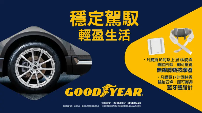 固特異輪胎《Goodyear》新年限定回饋活動開跑,買輪胎送按摩器或體脂計,舒適駕馭同步升級