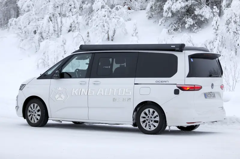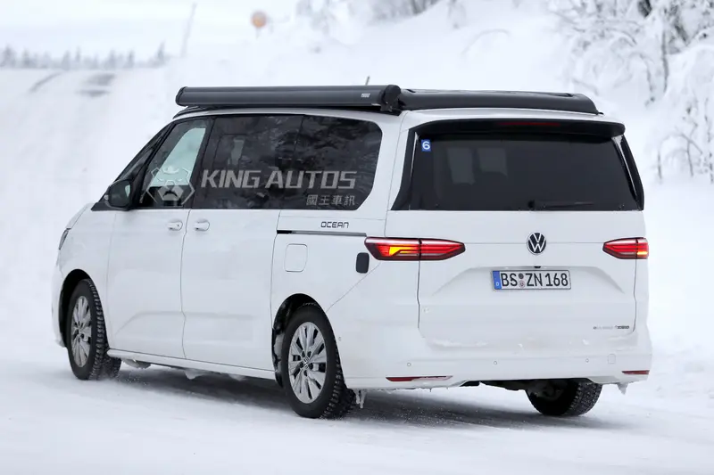 從曝光的偽裝車照片來看,這輛測試車的後葉子板上貼有Ocean字樣貼紙,顯示其為高階露營車型 California Ocean 的身分。全車幾乎沒有迷彩偽裝,車頭的變化已依稀可見。與現款最大差別在於頭燈組面積略微放大,且依照偽裝貼紙的走向判斷,新車將延續貫穿式LED燈條設計,並極有可能導入發光式廠徽,進一步提升夜間辨識度與科技感。另一個值得關注的重點在於前保桿設計。測試車的下進氣壩與兩側導流孔經過重新修飾,除了外型美觀外,也多少有空氣力學或強化引擎散熱效率的考量。