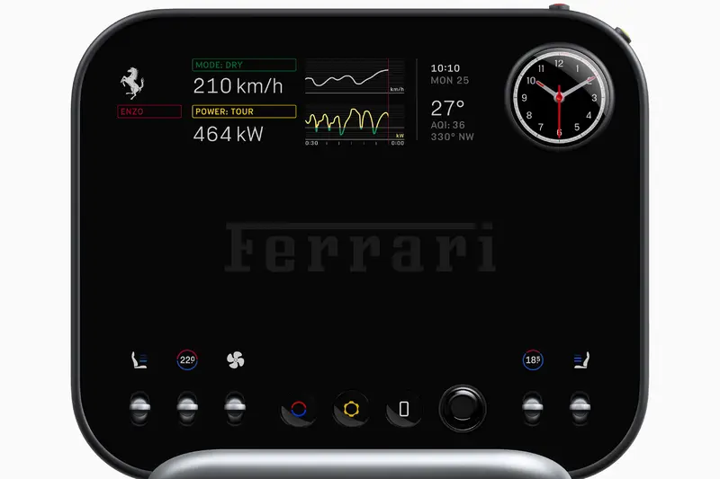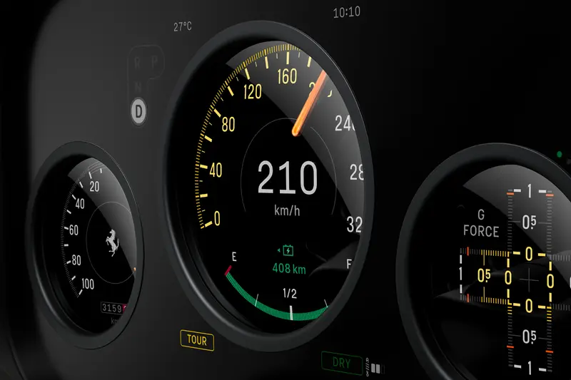 儀錶板隨方向盤轉動,優化駕駛者的視野,提升駕駛表現。安裝在轉向柱上的儀表板是法拉利系列車型的首創。它採用兩塊重疊的 OLED 顯示屏,呈現清晰的影像、鮮豔的色彩和無限的對比度,帶來前所未有的視覺體驗。它將數位和類比元素融合在一個與轉向柱相連的獨立單元中,並隨著方向盤的傾斜和轉動同步移動,以實現無縫互動。
