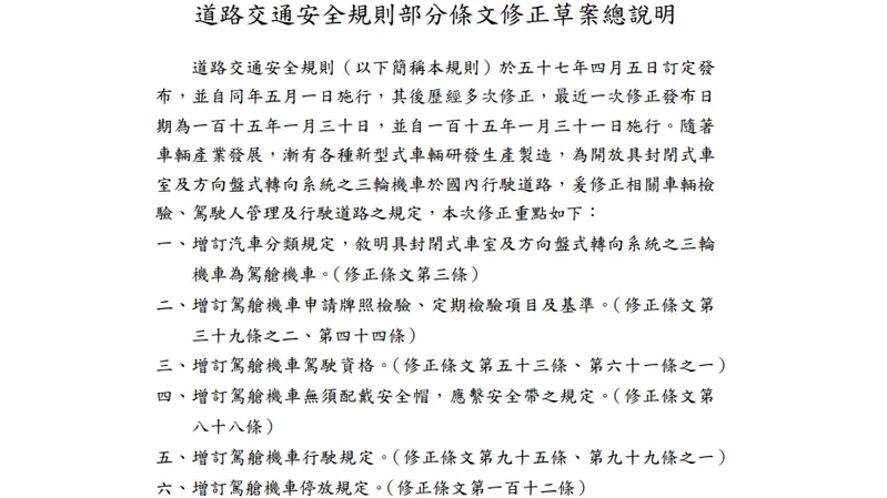 政府終於替這種「看起來像小車、但結構是三輪」的交通工具找到法律定位。未來只要符合封閉式車室與方向盤轉向系統,就會被歸類為駕艙機車,領的是機車牌,但駕駛門檻比一般機車高,必須持有小型車以上的汽車駕照,只有機車駕照不能開。