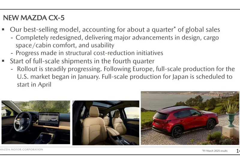 作為佔品牌全球銷量約25%的核心車型,全新CX-5的成功被視為品牌關鍵任務。新一代車型在設計、載物空間、座艙舒適性及大尺寸中央顯示幕的實用性上均有顯著提升。Mazda在經過嚴謹的品質驗證後,已於2025年12月中旬正式啟動量產,首波車輛將於本季起在歐洲與北美市場陸續交付,目前市場反應與經銷商預訂狀況皆優於預期。美國市場已於1月開啟全面投產,而日本市場則計畫於4月投產,並鎖定春季正式發表。