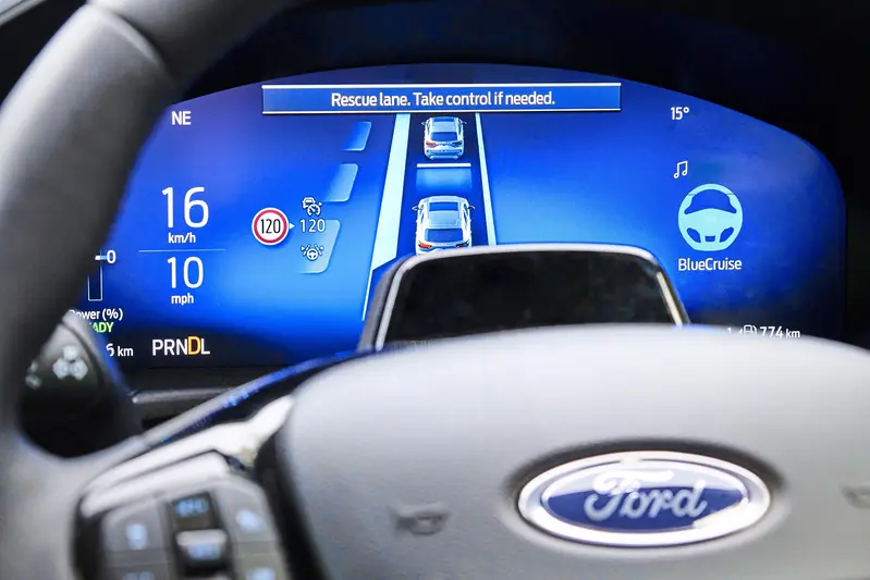 本次歐規Kuga升級的核心重點在於導入2023年在Mustang Mach-E車系首次使用的BlueCruise主動駕駛輔助系統。該系統已獲准在歐洲多個國家的特定高速公路路段(官方稱為BlueZones)使用。在這些路段中,Kuga駕駛者可將雙手離開方向盤,由車輛自動控制轉向、加速與煞車,大幅減輕長途行駛的疲勞。為了確保行車安全,系統配備了紅外線偵測鏡頭,會持續監測駕駛者的眼神與頭部位置,確保其注意力始終維持在前方路況。