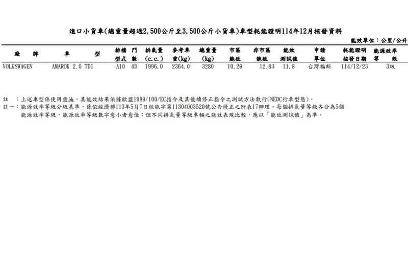 台灣福斯商旅即將在下(3)月為現行款二代Volkswagen Amarok新增全新2.0 TDI雙渦輪柴油車,參考先前送測資訊,該車型引擎排氣量1996c.c.,匹配10速手自排變速系統,平均油耗14.1km/l。相較於現款3.0升V6柴油車,在油耗與賦稅上更具優勢,當然,動力輸出也較小了些。