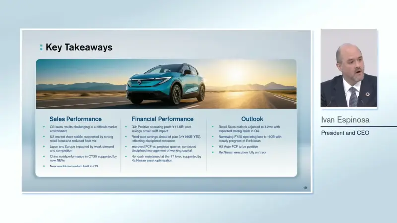 Nissan社長兼執行長Ivan Espinosa表示:「透過全體員工共同努力,我們在Re:Nissan計畫下穩步推進。短短十個月內已公布全部七座整合基地,固定成本改善進度顯著。雖然銷售持續承壓且關稅影響仍在,但我們維持營運專注,並看到產品陣容的正面動能。雖然2025財務將因非現金會計項目而錄得大幅淨損,但這些措施是強化長期營運表現的必要步驟。我們將持續鞏固財務基礎,並透過具競爭力新車上市提升營收,支持Re:Nissan目標達成。」