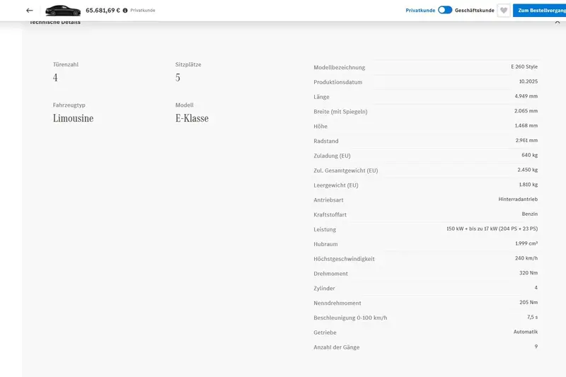 德國CPO網站上的那23輛E 260 Style車身長度都沒超過5米,軸距與台灣市場同為2,961mm,為W214標準軸車款。目前,中國市場上的標準軸E-Class為進口車,車源由德國進口,提供E 300與E 260兩種動力。當地生產的是長軸版本的V214,尺碼為5,092*1,880*1,493mm,軸距3,094mm,提供E 300 L與E 260 L兩種動力。中國市場上的E-Class無論軸距長度,入手門檻皆為人民幣89.88萬起(約台幣409萬元)。