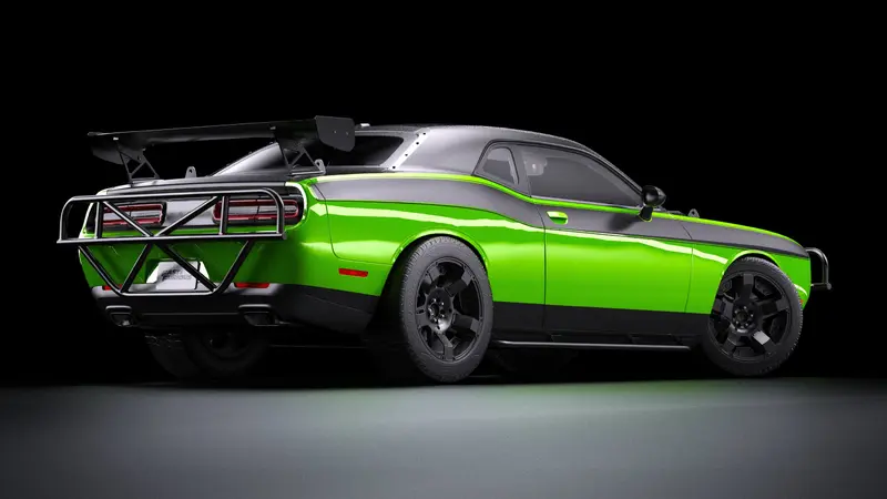 電影中的版本則進一步進行動作片專用改裝。車身高度被抬高,換上高行程懸吊與越野輪胎,使 Challenger 能夠在砂石路與崎嶇地形中高速行駛。寬輪距與外擴輪拱讓整體姿態更加粗壯,搭配深色塗裝與簡化的外觀細節,使整輛車看起來像是一台結合 肌肉車與拉力車風格的特製戰車。