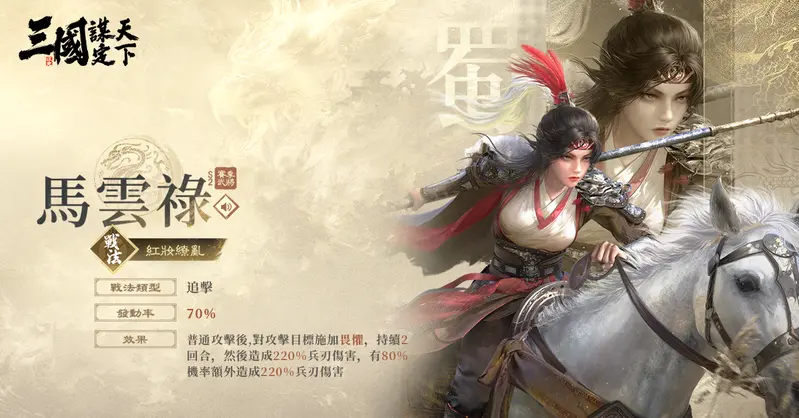 【馬雲祿】武將介紹:兵刃攻擊型武將。馬雲祿自幼習武,一身武藝可算是女中無雙,槍術極高。