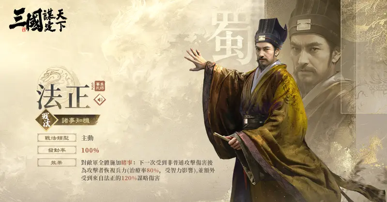 【法正】武將介紹:輔助型武將。多智、善奇謀,恩怨分明、睚眥必報,在政治鬥爭中不擇手段,也為劉備穩固了蜀漢基業。