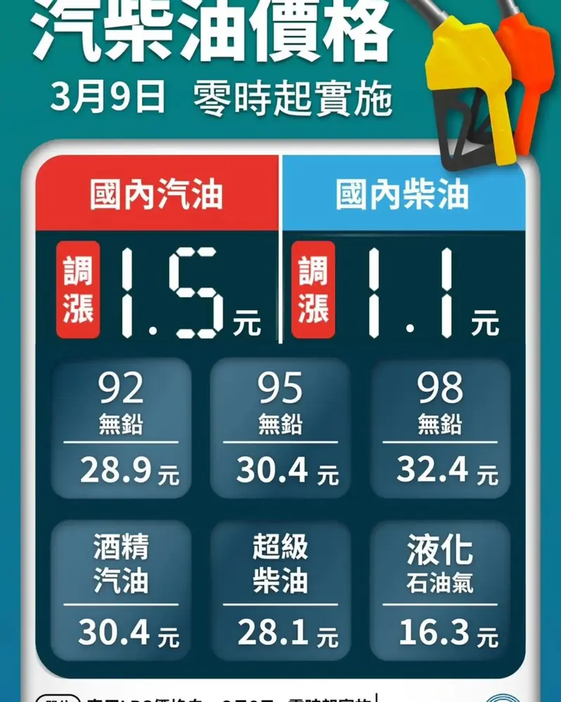 油價快訊|20260309(一)0點起|汽油漲1.5元 柴油1.1元