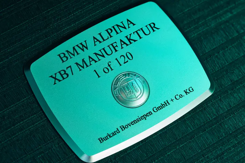 外觀部分,XB7 Manufaktur 標配 23 吋 ALPINA CLASSIC 鍛造鋁圈,並採用專屬的「鋁合金緞面(Aluminium Satin)」塗裝。車身細節包括擴展型黑色高光澤套件與專屬後下擾流設計,並於車尾鑲嵌 Manufaktur 銘牌。座艙內部展現了高品質手工藝,提供兩款專屬真皮內裝組合,並在座椅頭枕處壓印 Manufaktur 字樣。車室飾板可選擇碳纖維或專屬高光澤木紋材質,排檔桿與控制旋鈕則採用水晶材質,中央鞍座並鑲嵌有專屬編號銘牌,強調其限量 120 輛的稀有身份。
