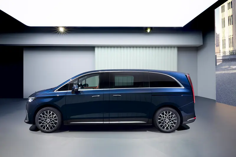 作為 140 年車輛製造史中首款採用模組化、可擴充式純電商旅架構的車型,VLE 的外觀比例與傳統燃油 MPV 有著顯著差異。開發團隊透過低斜的擋風玻璃與平整化底盤,使這輛龐然大物具備僅 0.25 Cd 的極低風阻係數,不僅優化了能源效率,更顯著降低高速行駛時的風切雜音。在視覺語彙上,車頭隆起的雙動力線條配合 reinterpreted 品牌格柵,搭配數位燈光(DIGITAL LIGHT)與貫穿式星芒日行燈,展現出強烈的未來感;車尾則以倒 U 型連貫式 LED 燈組與氣流導引翼融合,建構出辨識度極高的流線身影。