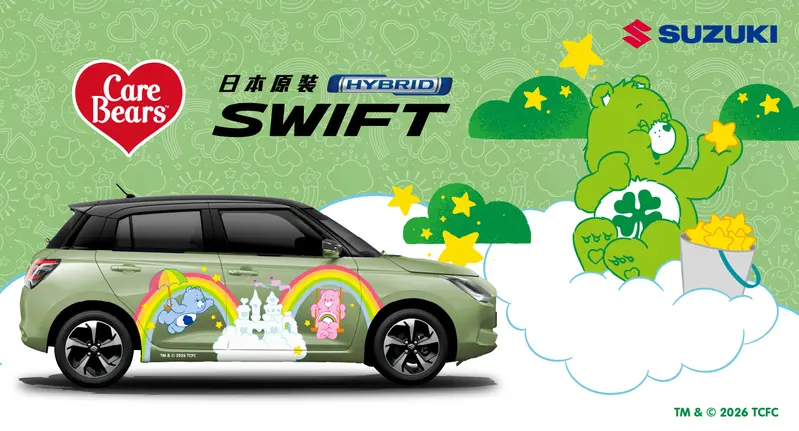 TAIWAN SUZUKI 攜手經典療癒IP Care Bears,推出限量「SWIFT | Care Bears」彩繪特仕車款。以 Care Bears 經典角色元素為靈感,搭配SWIFT質感車身配色與經典圖騰設計,在陽光下展現恰到好處的亮眼層次。車艙內亦融入專屬Care Bears識別細節,從外到內完整呼應,讓每一次打開車門,都像走進專屬於自己的風格空間。風格,往往就在這些日常片刻之間悄然定義。