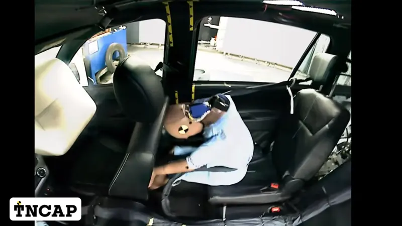 導致 Zinger 此次評等重挫的關鍵,主要源於測試中暴露的被動安全結構漏洞。在執行比國家強制性安全法規更為嚴苛的「前方偏置」與「前方全寬」兩項撞擊試驗時,Zinger 意外發生了第二排座椅椅腳鎖扣脫開的狀況,導致座椅在撞擊瞬間無法穩固於車體。此外,前方全寬撞擊試驗顯示,第二排座椅安全帶竟然出現脫開現象,造成乘客失去有效的物理束縛,這使得該車在成人保護領域僅取得 43% 的得分率。