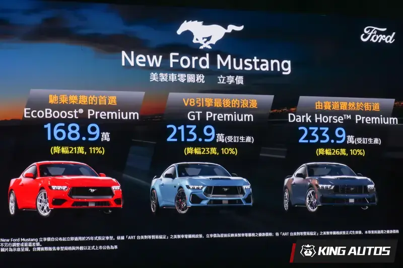 這次以美製車0關稅為架構得出的新價格,讓福特六和 Mustang 車系來到歷史新低。入門2.3 EcoBoost Premium 降到168.9萬元、GT Premium車型為 213.9 萬元、Dark Horse Premium車型為233.9萬元。