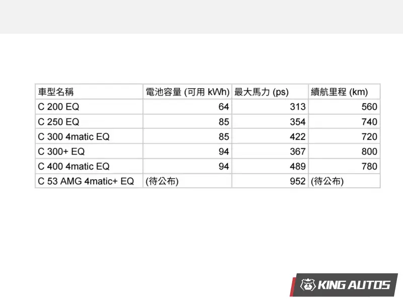 C-Class EQ 首波主打將由 C 400 4matic EQ 領軍,搭載 94 kWh 電池組,提供高達 489 匹的最大馬力。後續預計於 2026 年底前追加續航力更強的後驅車型 C 300+ EQ,其 WLTP 標準下的續航里程可望突破 800 公里。針對極致性能需求,品牌亦規劃了 C 53 AMG 4matic+ EQ 頂級版本,預計動力將上看 952 匹。其餘車型之訂購預計於 2027 年全面開放。
