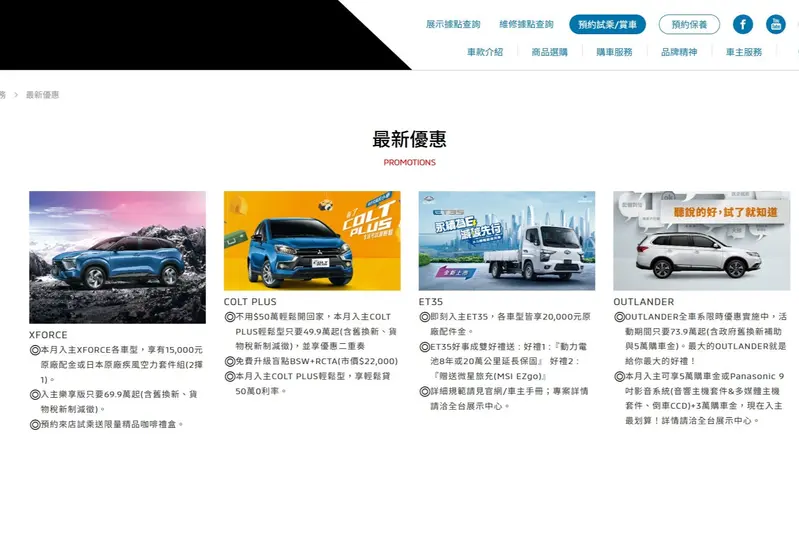 家庭 SUV 主力 Outlander 則在本月展現出驚人的讓利幅度。全車系限時優惠實施中,配合政府舊換新與原廠 5 萬購車金後,入主價格降至 73.9 萬起,堪稱同級最具性價比的空間首選。車主亦可選擇另一種方案,即 「Panasonic 9 吋影音系統(含多媒體主機與倒車 CCD)搭配 3 萬元購車金」,讓車主在預算與科技配備之間,取得最符合家庭需求的平衡點。