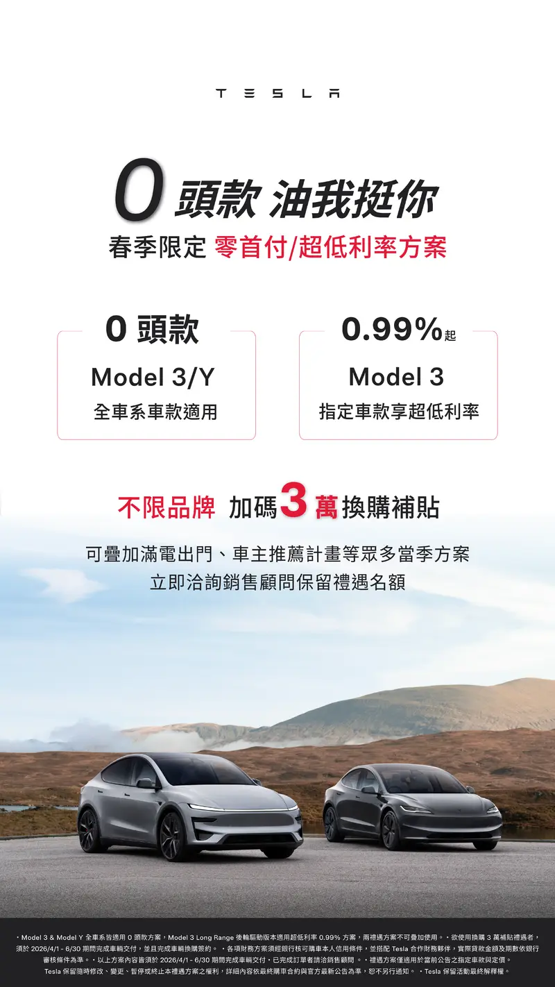 2026 年第一季新車掛牌總結算,Tesla 展現強勁成長力道,3 月交付 5,421 輛新車,登進口車全品牌銷售榜首;Model Y 單一車款橫跨台灣全車種新車銷售冠軍,超前排名亞軍之車款近 3 成掛牌數領先。近日 Tesla 開放下訂 Model Y 全車系黑化版本,包含全新深黑頂棚、黑化鍍鉻銘牌,及選配黑化輪圈。針對第二季新購及油車換購車主,Tesla 首次推出「不限品牌換購 Tesla 均享 3 萬元加碼補貼」,且 Model 3 及 Model Y 全車系均可零頭款入主,及 Model 3 指定車款 0.99% 超低月付利率。