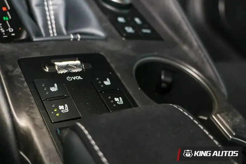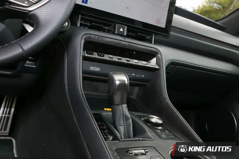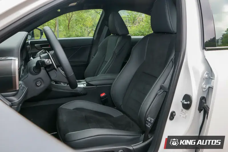駕駛介面部分,配置 F Sport 專屬真皮包覆方向盤並附有換檔撥片,握感厚實且具備高度指向性。座椅方面,雙前座整合了電動調整、通風、加熱、記憶及駕駛座腰靠扶力調整等全方位機能;而在材質選用上,試駕車特別採用 F Sport 頂級皮革與 Ultrasuede 人造麂皮混搭,不僅大幅提升摩擦力與防滑表現,更在高強度操駕時提供優異的身體包覆性,兼具豪華質感與競技需求。