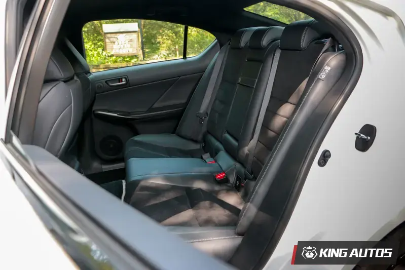 轉至後座空間,受限於縱向引擎與後驅平台的先天架構,空間表現向來非IS車系的強項。受傳動軸影響,中央底板隆起滿高的,加上腳部伸縮空間略顯侷促,建議把它當作四人座轎車心裡會比較平衡。以身高180公分的乘員進行實測,膝部約一個拳頭大,頭部則剩餘兩指幅,加上沒有天窗,感覺較為緊湊。不過,後座泡棉保有品牌一貫的優異支撐性與舒適度,並配置基礎後座出風口與兩組TYPE C充電口,舒適與機能性不落人後。