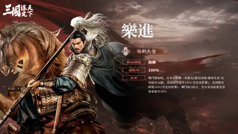 樂進,東漢末年傑出將領,以其勇猛果敢、戰功卓著而聞名於世,是曹魏「五子良將」之一。樂進自帶戰法「每戰先登」能提升自身與隊友先攻/傷害與減傷。