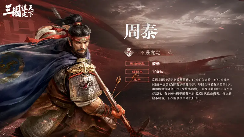 周泰,三國時期東吳悍將,以忠勇著稱於世,他早年便投身孫氏麾下,隨孫權東征西討屢建奇功。周泰自帶戰法「不屈意志」有機率為隊友承傷,且自身有機率規避致命傷害。