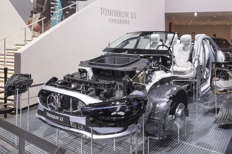 除了量產車型,Mercedes-Benz 現場展出「Tomorrow XX」技術方案。這項計畫將 VISION EQXX 的研發邏輯延伸至全車系,展示超過 40 種環境友善零件與回收材質,強調從設計階段即納入碳中和與資源循環的理念。
