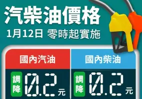 油價快訊|20260112(一)0點起|汽油降2角 柴油降2角