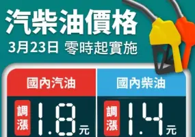 台灣中油公司自下週一(23日)凌晨零時起汽、柴油價格各調漲1.8元及1.4元,參考零售價格分別為92無鉛汽油每公升30.7元、95無鉛汽油每公升32.2元、98無鉛汽油每公升34.2元、超級柴油每公升29.5元。台灣中油表示,本週受伊朗擴大...2026/03/21 繼續閱讀 -