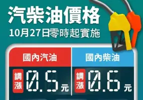油價快訊|20251027(一)0點起|汽油漲5角 柴油漲6角