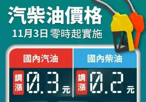 油價快訊|20251103(一)0點起|汽油漲3角 柴油漲2角